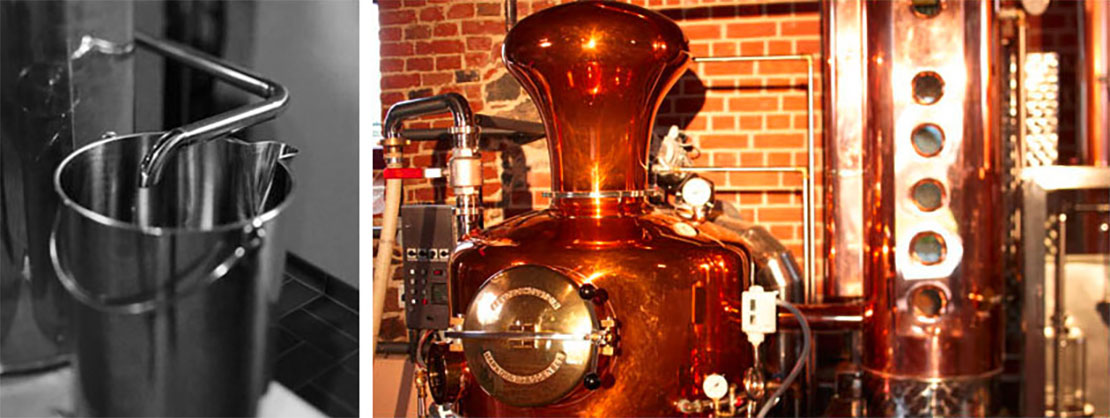 Die kupferne Brennanlage wurde harmonisch in den Pferdestall integriert, so dass dessen schlichter und gleichzeitig eleganter Charakter dabei vollständig erhalten blieb. Beide zusammen bilden nun eine unvergleichliche Symbiose aus Technik und Geschichte. Hergestellt wurde die Anlage vom führenden Brennereianlagenhersteller Arnold Holstein in Markdorf am Bodensee. Die Brennblase fasst 550 Liter und weist vier Böden in der Verstärkerkolonne auf. Komplettiert wird die Anlage von einem außergewöhnlich langen Kühler und dem heute obligatorischen Katalysator. Somit setzt Cornelia Bohn eine mehr als 150 Jahre alte preußische Tradition in Schönermark fort und auf fast schon wundersame Weise erhält ein Gebäude nach 60 Jahren wieder eine großartige Aufgabe. |